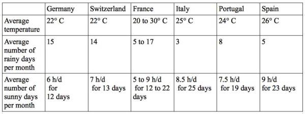 * These values are the average temperature values in the months from April to October. France has the biggest difference between the lowest and the highest value. This is why we chose to represent the average temperature as a values between two values.
