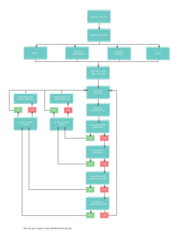 Once the values are under control, it was thought to be necessarily considered the possibility of having a full range of different values in order to adequate the process to the kind of food desired to dehydrated by the user. This implies that the user needs to interact with the Arduino to be capable to select the proper program. That’s the main reason of having an LCD Shield with buttons in the electronic system. The LCD permits a visual interaction and the buttons permit the user to surf through a specific menu where it is shown a variety of foods to dehydrate. The use of an LCD and moreover the use of buttons requires also a specific library. Here in Figure 44 is shown a flow chart of the code used for the Solar dehydrator